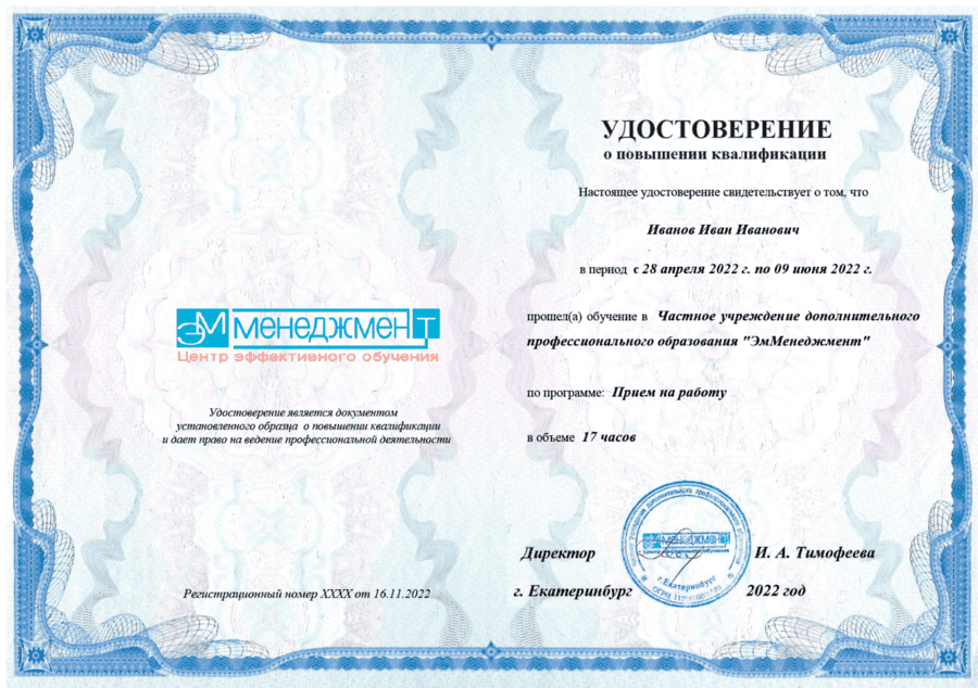 Когда слушатель курса по порядку приема на работу завершает процесс обучения в ЭмМенеджмент в Копейске, он получает удостоверение, как подтверждение пройденной программы. Учебный центр ведет деятельность на основании лицензии Министерства образования.